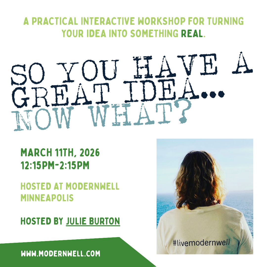 Led by Julie Burton, Founder of ModernWell and an “I’ve got a great idea” enthusiast who has founded and co-founded six companies, co-created a podcast, written and published a book, and raised four kids along the way. She knows what it takes to move an idea out of your head and into the world—and she’s passionate about helping others do the same!